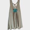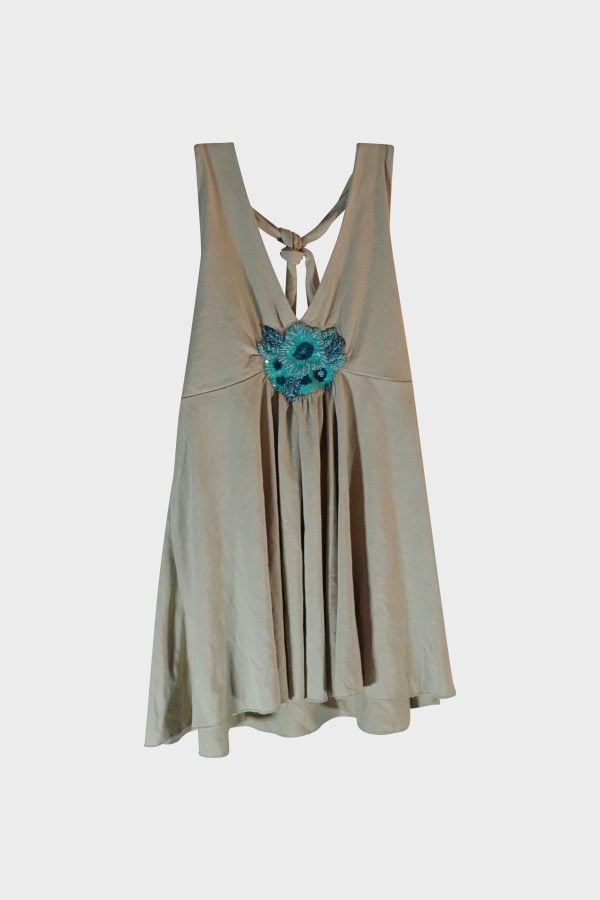 Dieses beigefarbene Top hat einen A-Linien-Schnitt und einen Neckholder-Ausschnitt. Der lockere, fließende Schnitt ist typisch für entspannte, sommerliche italienische Mode. Ein besonderes Merkmal des Tops ist die broscheförmige Applikation. Wählen Sie Beige oder Türkis in Unifarben, da diese Farben gut zum Outfit passen. Weiß bildet eine frische, klare Basis, die das Türkis dezent hervorhebt.