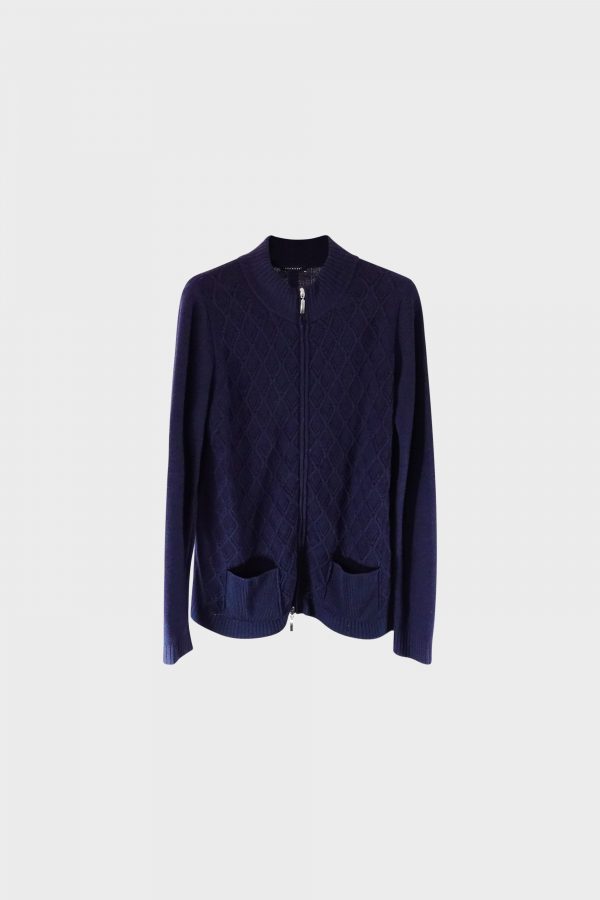 This midnight blue with diamond-shaped cable patterns pullover is suitable for every day casual outfit. Due to its neutral color can be combined with different neutral colors like white, gray, dark blue or black. The zipper and the front two pockets emphasize the casual nature of the sweater. The zipper lets you regulate the temperature and decide whether you want to keep it open or closed. It’s suitable for both men and women. It is in excellent used condition with no visible defects.