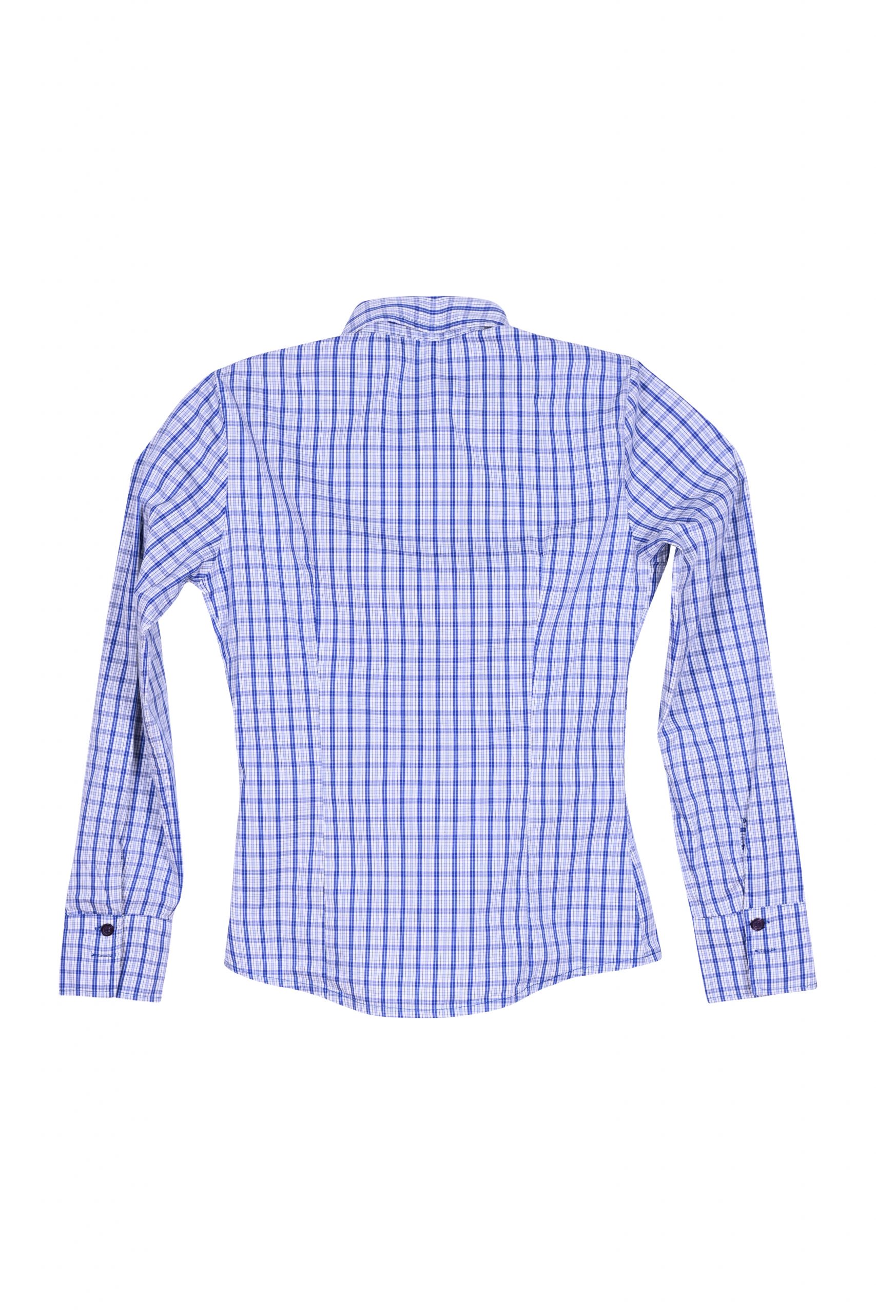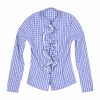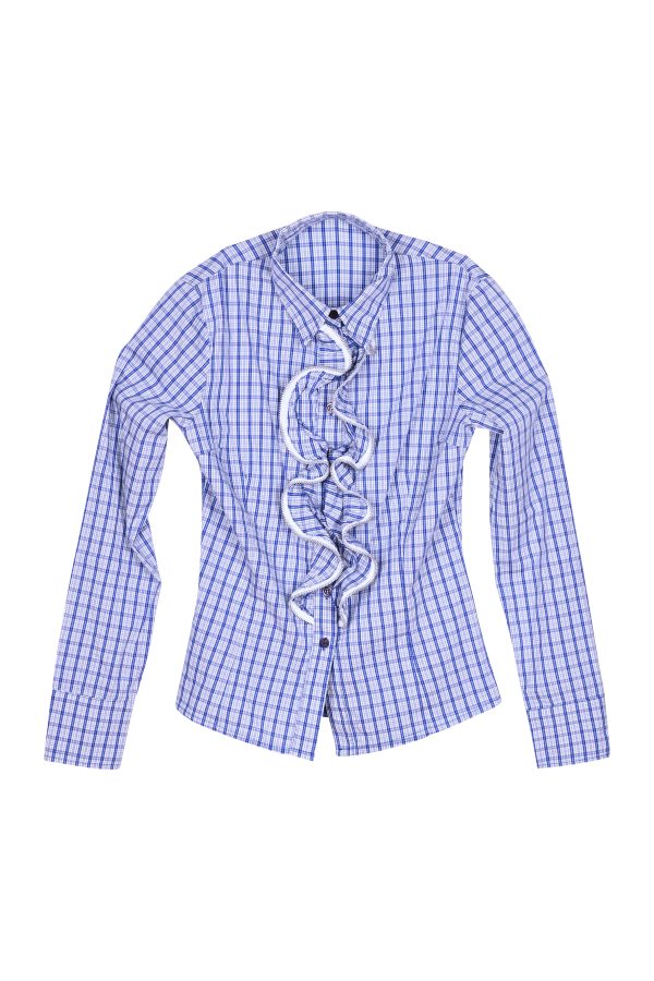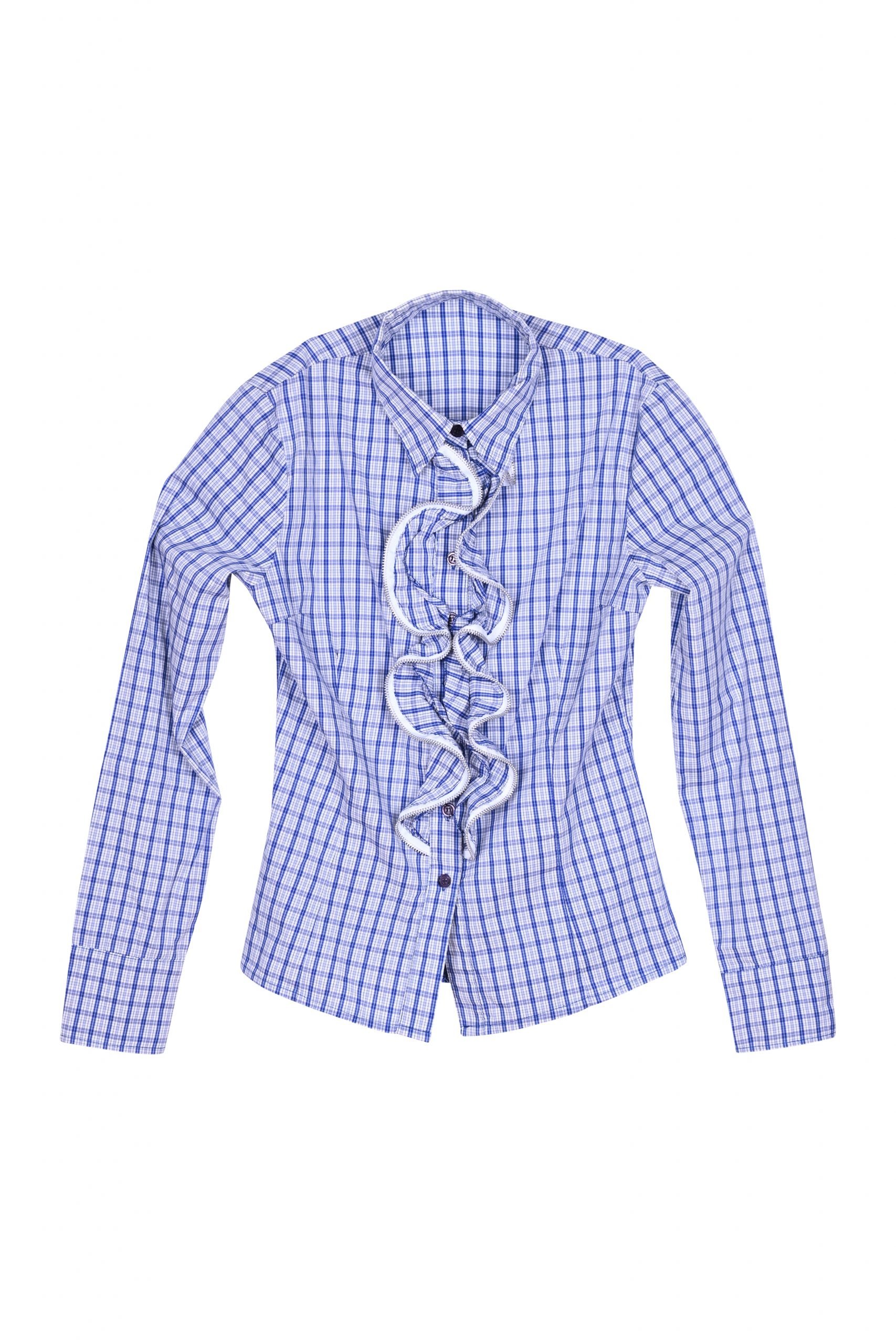The blue and white checked-pattern blouse with front ruffles works equally well in the office or during leisure time. Pair it with blue or white trousers, with straight-cut trousers such as chinos or blue jeans being perfect. Combined with a single-row blue sports coat and loafers, it is an ideal work outfit, and you can dress it up with heels. There are no visible flaws.