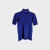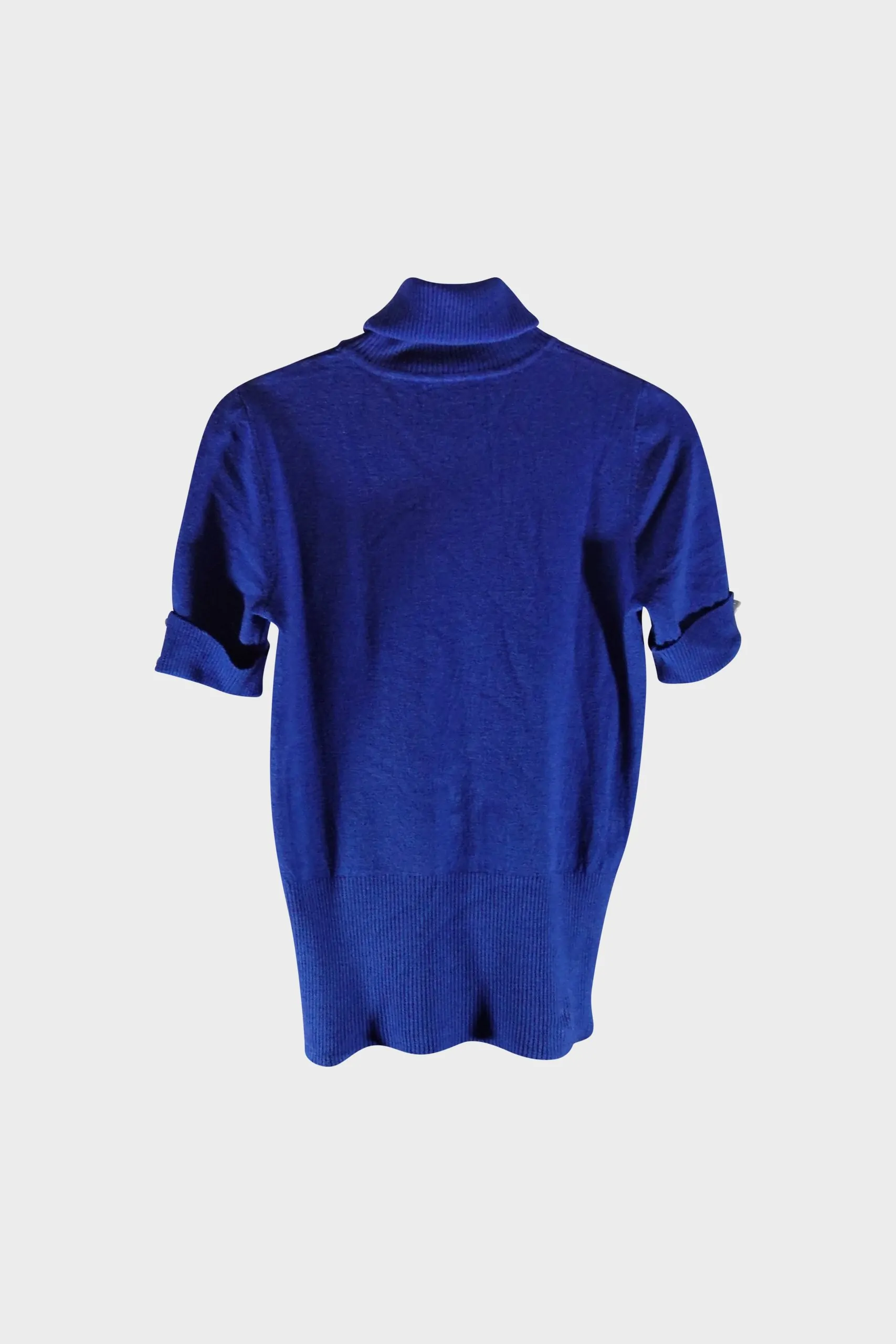 This short-sleeved turtleneck sweater in vibrant blue has a fitted silhouette. For a sophisticated look, bottoms in black, dark blue, or cream are ideal. For a casual, modern look, dark or white jeans are a good choice. Silver accessories can add a touch of elegance.