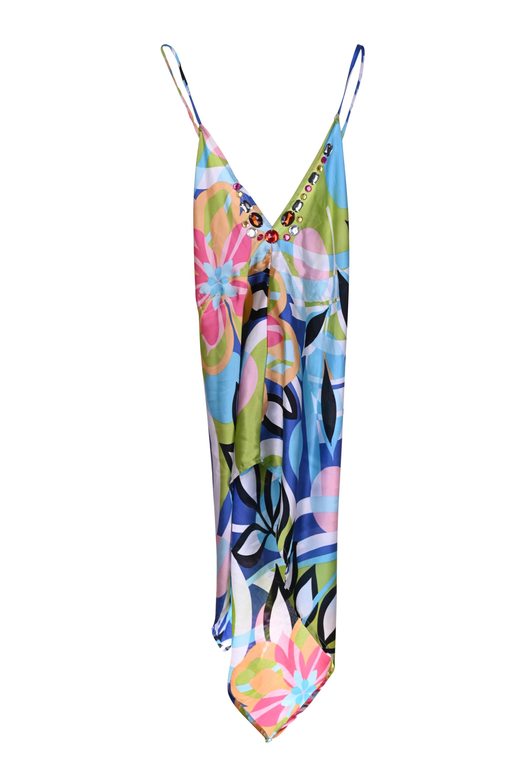 With its V-neck and front decorations, this chic top radiates the joy of life. The V-neck and asymmetric, narrow cut create a slimming effect. Perfect for those who aren’t afraid of bright colours, like American style icon Iris Apfel.