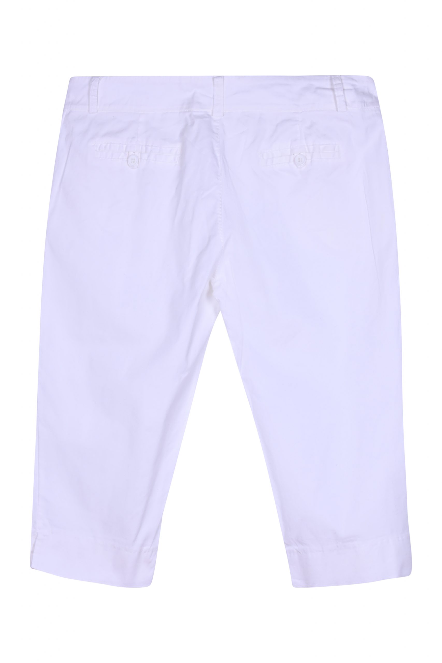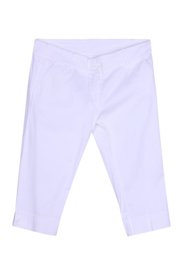 These Bermuda-style trousers in true white combine casualness and comfort. White can be combined in many ways, from a total look in white to pairing with sand white for a monochromatic summer vibe. They feature two pockets with closable buttons on the back. They pair well with a cotton t-shirt or a linen shirt, sneakers, or espadrilles. Easy to care for and machine washable at 30 degrees. There are no visible flaws.